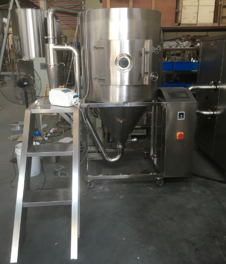 制備出真正的圓球狀實心微球顆粒,首選實驗可用上海歐蒙生產的OM-5000型實驗型噴霧干燥機。實驗型噴霧干燥機系統(tǒng)工作流程如圖所示。該系統(tǒng)的工作原理是空氣經過電加熱以后,再通過高溫過濾器,以保證進人塔體的空氣是潔凈熱空氣,然后通過干燥室頂部的熱風分配器,通過熱風分配器的熱空氣均勻地進人干燥室內并呈螺旋狀轉動,同時將料液送至離心噴霧頭。鋁礬土料漿被高速旋轉的噴霧頭噴射成球形霧滴,水分迅速在霧滴表面蒸發(fā),在極短的時間內,霧滴干燥收縮成為微球坯體。較粗的微球顆粒由干燥室底部的收集桶收集,較細的微球顆粒通過設在錐底的管道流到旋風分離器,并由套在旋風分離器底部的收集桶收集。廢氣通過除塵器排出。